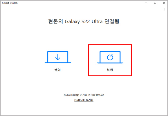 스마트 스위치 실행 > 휴대폰 연결 > 복원 누름