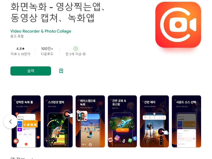 이 어플은 구글플레이스토어에서 "핸드폰 화면 녹화"로 검색했을때 3번째로 나오는 어플입니다. 아래는 화면녹화 - 영상찍는앱、동영상 캡쳐、녹화앱 어플에 대한 자세한 설명이니 참고하세요.