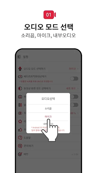 - 오디오 켜기 또는 끄기로 화면 녹화
