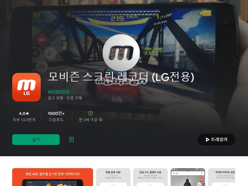 이 어플은 구글플레이스토어에서 "핸드폰 화면 녹화"로 검색했을때 5번째로 나오는 어플입니다. 아래는 모비즌 스크린 레코더 (LG전용) 어플에 대한 자세한 설명이니 참고하세요.