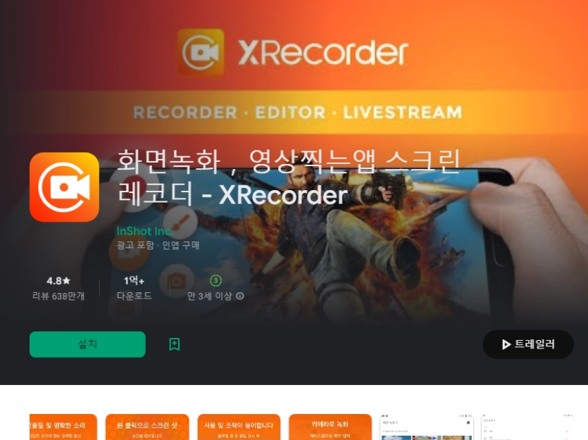 이 어플은 구글플레이스토어에서 "핸드폰 화면 녹화"로 검색했을때 1번째로 나오는 어플입니다. 아래는 화면녹화,영상찍는앱 스크린 레코더 - XRecorder 어플에 대한 자세한 설명이니 참고하세요.
