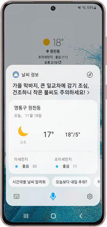 예를 들어, 측면 버튼을 누른 채 “오늘 날씨 어때?”라고 말하면 날씨 정보가 나타납니다. 내일 날씨도 알고 싶다면 다시 측면 버튼을 누른 채 “내일은?” 이라고 말하면 빅스비가 대화의 맥락을 이해해 내일 날씨 정보를 알아서 보여줍니다.