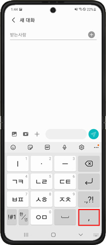 1. 키보드 창에서 쉼표 표시를 길게 터치해 주세요. ( ※ 개인 설정에 따라 , 쉼표가 아닌 다른 기호가 표시될 수 있으니 해당 위치를 길게 터치해주세요.)