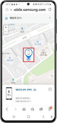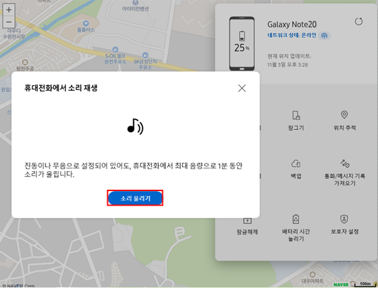 ② 지도 상에 표시된 휴대폰 위치가 가까운 곳일 경우 해당 위치에 가서 '소리 울리기'를 진행해 보십시오