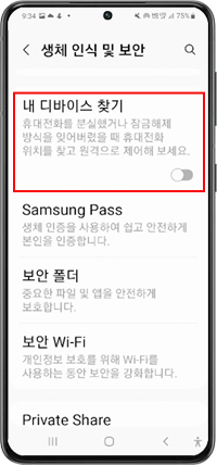 ☞ 설정 > 생체 인식 및 보안 > 내 디바이스 찾기 > 사용 중 > 원격 잠금해제 ON 켜기