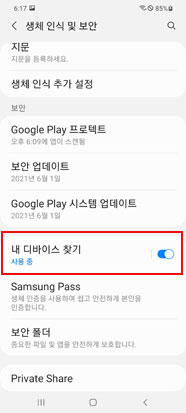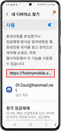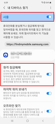 ☞ 설정 > 생체 인식 및 보안 > 내 디바이스 찾기 > 사용 중 > 원격 잠금해제 ON 켜기