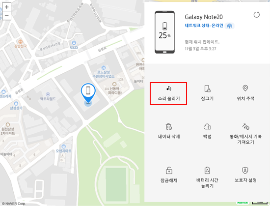 ② 지도 상에 표시된 휴대폰 위치가 가까운 곳일 경우 해당 위치에 가서 '소리 울리기'를 진행해 보십시오