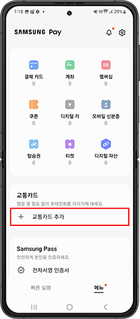 삼성페이 실행 > 메뉴 > 교통카드추가 > 캐시비 교통카드 추가