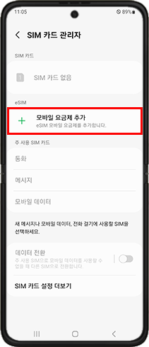 설정 > 연결 > SIM 카드 관리자 > 모바일 요금제 추가 > 통신사 QR 코드 스캔