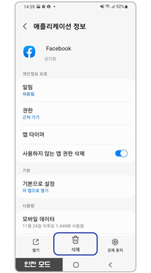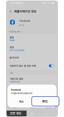 매우 낮은 확률로 기기가 악성코드에 감염됐다면 안전 모드에서 해당 앱을 삭제하면 됩니다.