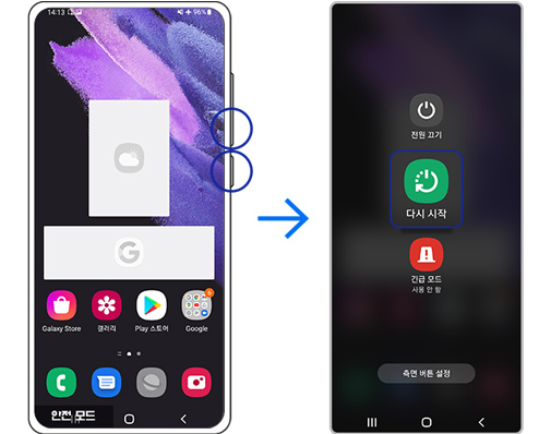Step 3. 화면이 꺼진 후 측면 버튼과 음량 (하) 버튼을동시에 눌러줍니다