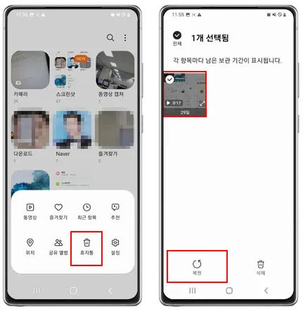 갤러리 앱 > 메뉴 > 휴지통 > 복원