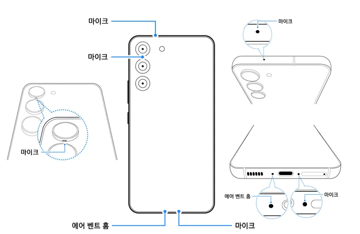 갤럭시 S23/S23+/S23 Ultra 모델은 원활한 통화 및 녹음 성능을 위해 3개의 마이크 홀이 적용되어 있습니다.