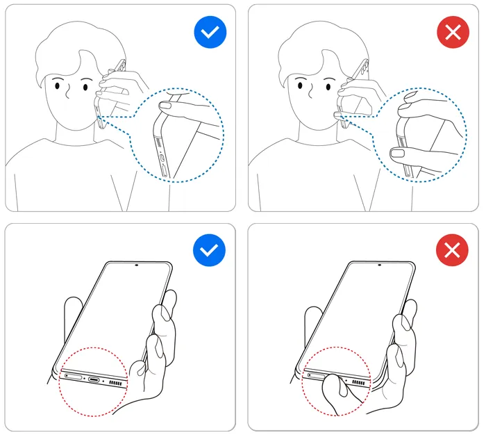 보호필름, 케이스, 커버 등으로 기기의 리시버, 마이크 홀, 에어 벤트 홈 등을 막았거나 통화 중 손으로 기기를 잡을 때 해당 부위를 막았을 가능성이 있습니다.