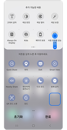 A. 네. One UI 5에서는 퀵 패널에서 추가하여 간편하게 ON/OFF할 수 있습니다.