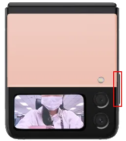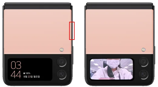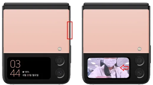 접힌 상태에서 측면(지문인식) 버튼을 빠르게 두번 선택→ 촬영할이미지가 표시되면→ 볼륨 버튼을 눌러 촬영하세요.