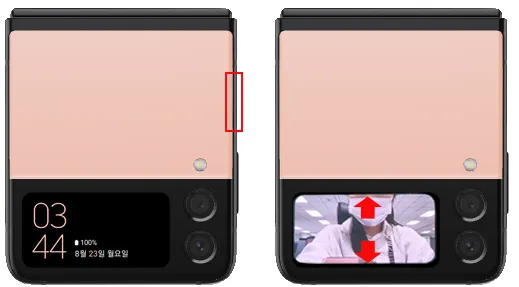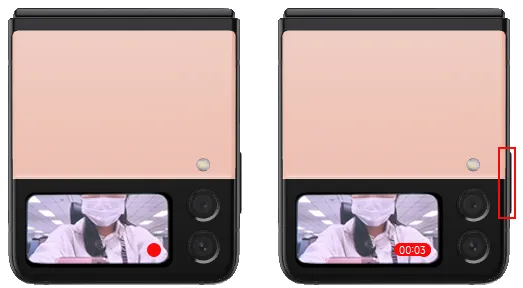 접힌상태에서측면(지문인식)버튼을빠르게두번선택→사진모드에서우측방향으로드래그→동영상모드로전환→볼륨버튼을눌러촬영시작→볼륨버튼을눌러촬영종료후자동저장