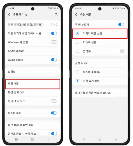 •카메라설정→유용한기능→측면버튼→두번누르기→카메라빠른실행,빅스비실행,앱열기중카메라빠른실행을설정후사용하세요.