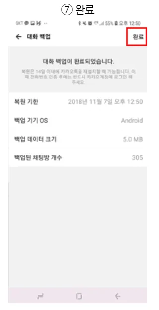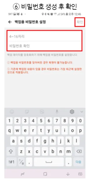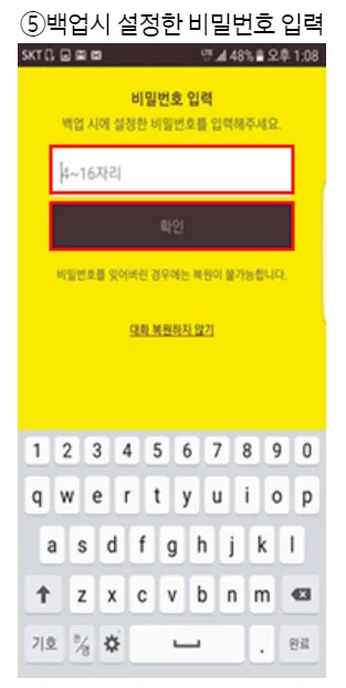 대화 내용 백업 시 생성한 비밀번호 찾기 기능 미지원으로 분실하지 않도록합니다.