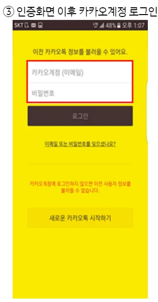 * 카카오계정에 로그인하지 않을 경우 신규가입으로 처리되어 기존 정보가 모두 초기화됩니다.