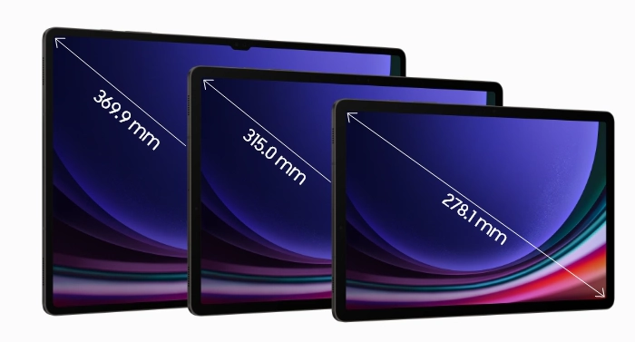 삼성전자는 '갤럭시 탭 S9 시리즈'를 선보였습니다. 이번 시리즈에는 '갤럭시 탭 S9 울트라', '갤럭시 탭 S9+', 그리고 '갤럭시 탭 S9' 세 가지 모델이 포함되어 있으며, 각각 36.99cm, 31.5cm, 그리고 27.81cm 크기의 스크린을 갖추고 있습니다. 이 모델들은 전 모델에 비해 크기가 커져 높은 몰입감을 제공하는 16:10 화면 비율을 채용했습니다.