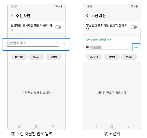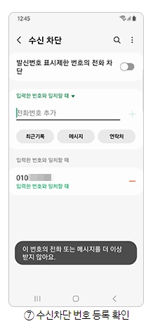전화 > 더 보기 > 설정 > 수신 차단 > 수신 차단할 번호 입력 > + 선택 > 수신차단 번호 등록 확인