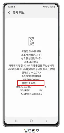 갤럭시S8 이후 출시 제품부터 설정→ 휴대전화 정보→ 규제 정보→ 일련번호 확인이 가능합니다.