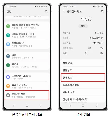 케이스를 교체하신 경우 설정→ 휴대전화 정보→ 규제 정보에서 확인 가능합니다.