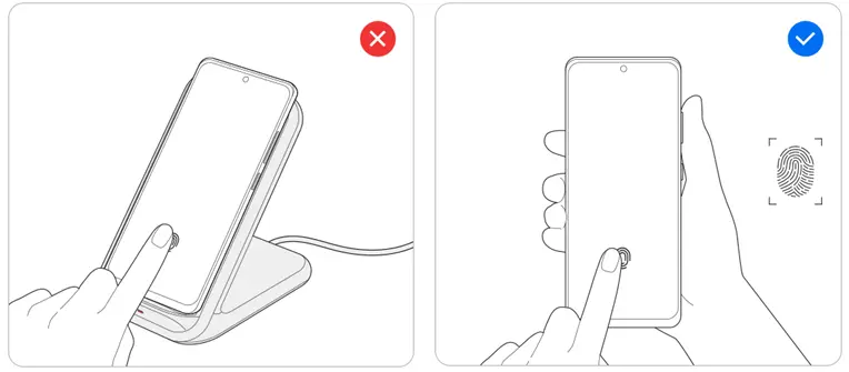지문 인식이 안되는 경우, 지문 인식기에 손가락을 대기 전에 스마트폰의 스크린 프로텍터 상태, 무선 충전 여부 그리고 손가락이 깨끗한지 확인하십시오.