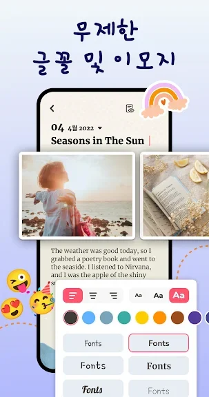 저희는 무제한 내용 편집 옵션, 사진, 이모지, 기분 등을 제공합니다. 또한, 사용자는 세련된 글꼴과 배경으로 내용을 장식할 수 있습니다.