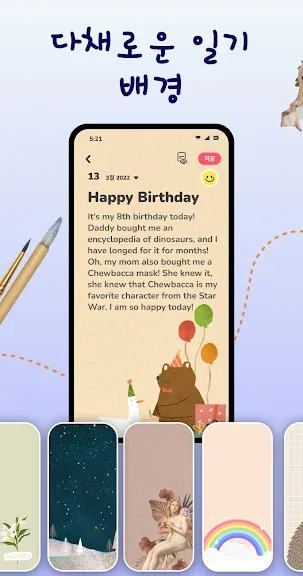 - 일기를 작성 할 때 배경을 선택하여 다이어리를 예쁘게 꾸며 보세요.