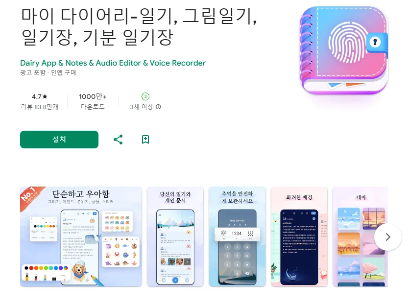 이 어플은 구글플레이스토어에서 "비밀 일기"로 검색했을때 3번째로 나오는 어플입니다. 아래는 마이 다이어리-일기, 그림일기, 일기장, 기분 일기장 어플에 대한 자세한 설명이니 참고하세요.