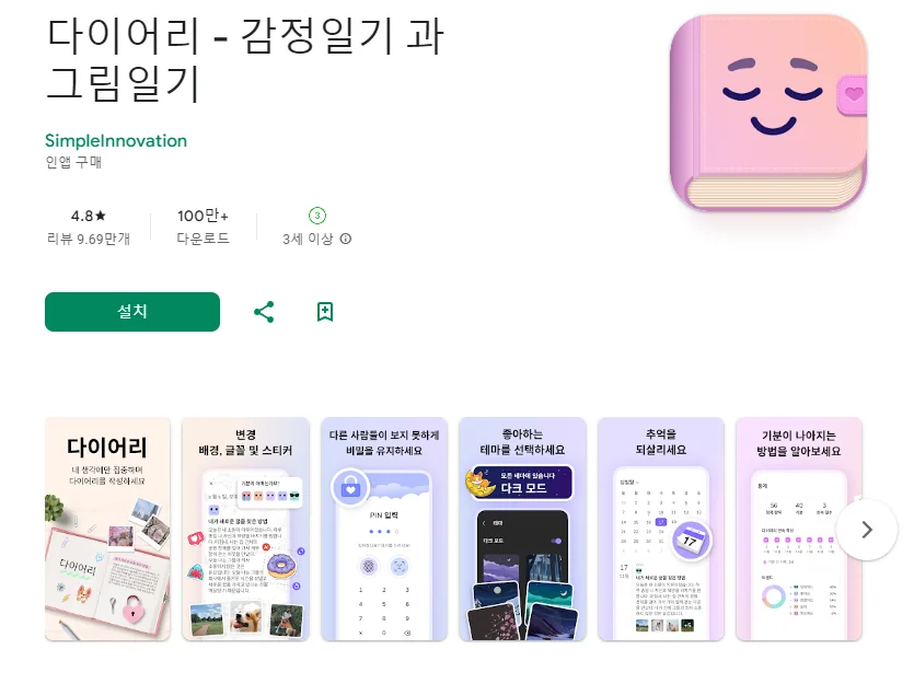 이 어플은 구글플레이스토어에서 "비밀 일기"로 검색했을때 5번째로 나오는 어플입니다. 아래는 다이어리 - 감정일기 과 그림일기 어플에 대한 자세한 설명이니 참고하세요.