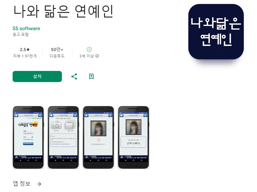 이 어플은 구글플레이스토어에서 "나와 닮은꼴 연예인"로 검색했을때 4번째로 나오는 어플입니다. 아래는 닮음꼴 연예인 찾기 어플에 대한 자세한 설명이니 참고하세요.