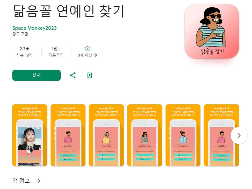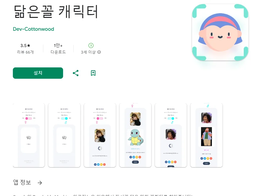 아래는 닮은꼴 캐릭터 어플에 대한 스크린샷 정보입니다.