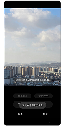 갤러리 > 편집할 사진 - 편집 아이콘 > 더보기 아이콘 > AI 지우개 > 빛 반사 지우기 > 지우기 완료