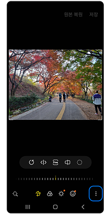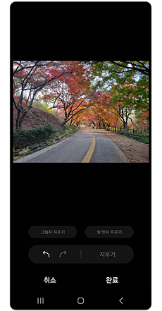 갤러리 > 편집할 사진 - 편집 아이콘 > 더보기 아이콘 > AI 지우개 > 그림자 지우기 > 지우기 완료