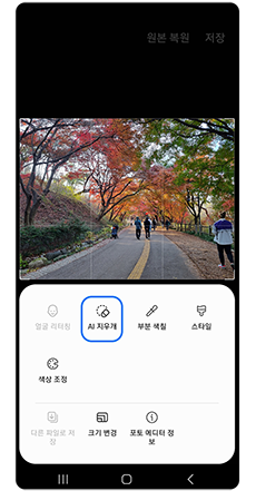 갤러리 > 편집할 사진 - 편집 아이콘 > 더보기 아이콘 > AI 지우개 > 지울 개체 선택 > 지우기 완료