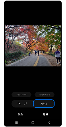 갤럭시 S23 사진 편집 기능 중 하나인 AI 지우개 기능은 촬영된 사진에서 불필요한 개체를 선택하여 지울 수 있는 기능입니다.개체 지우기 외에도 그림자 지우기/빛 반사 지우기를 실행하면 의도치 않게 찍힌 그림자, 빛 반사도 AI로 분석하여 자동으로 지워줍니다.